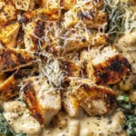 Once the chicken is ready, stir in the fresh spinach and let it wilt. This should only take a few minutes and will create a beautiful, vibrant green contrast to the chicken.
